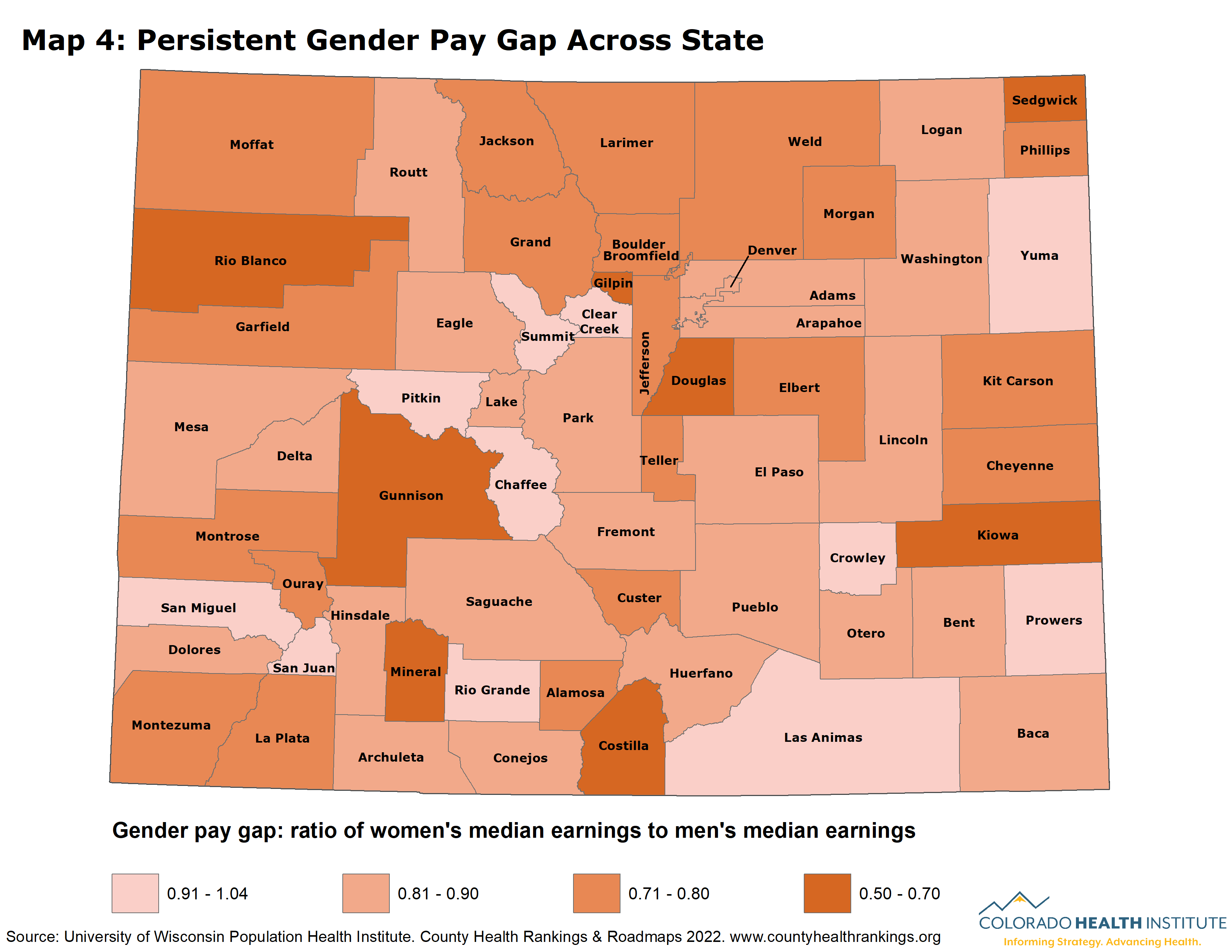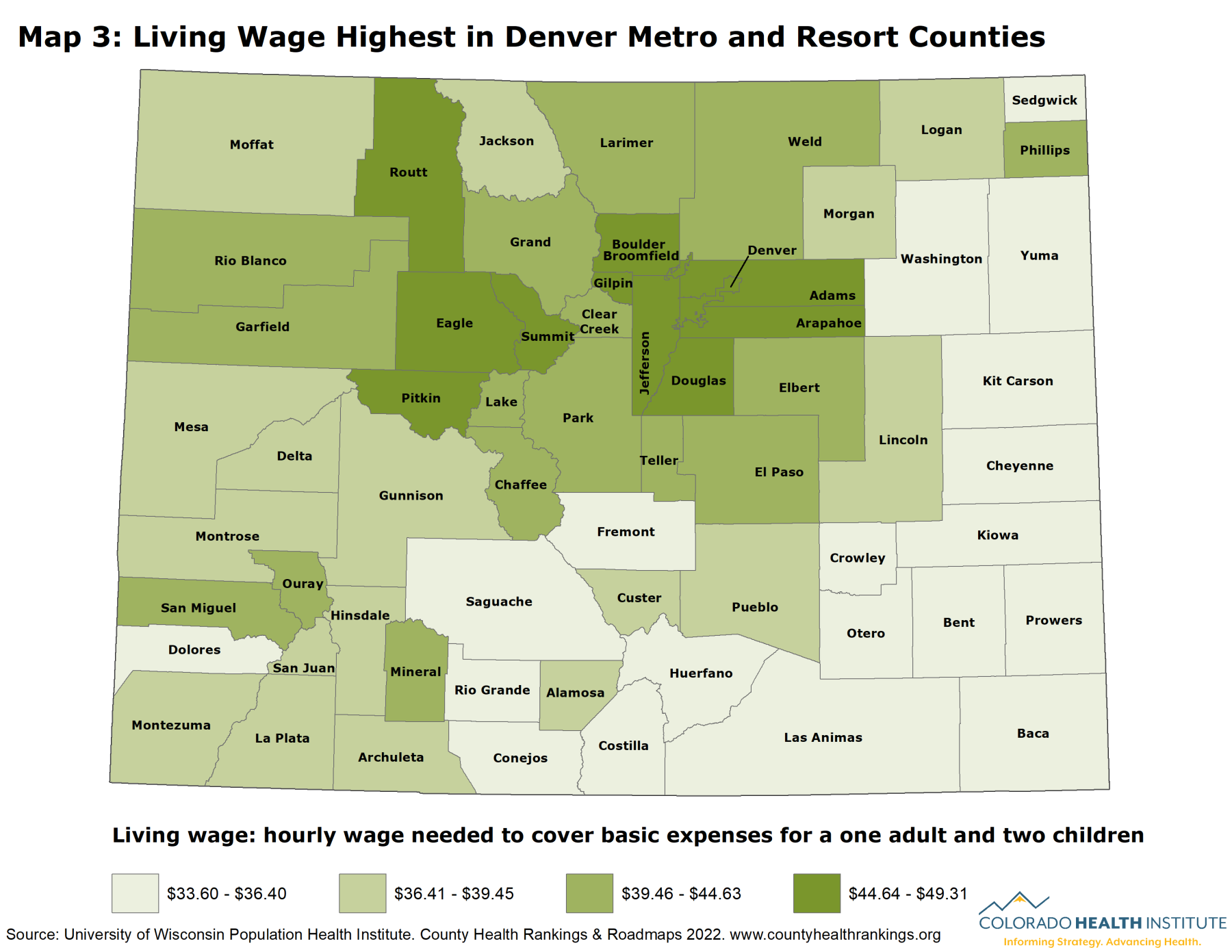 This year, the County Health Rankings included new data to spotlight the importance of pursuing economic security for everyone in a community. The COVID-19 pandemic exposed and worsened many barriers that women, people of color, and low-income families face, in many cases widening existing inequalities. The new County Health Ranking data help reveal the landscape of economic barriers that Colorado families face by showing the cost of child care, gender pay gap, and living wage for each county.