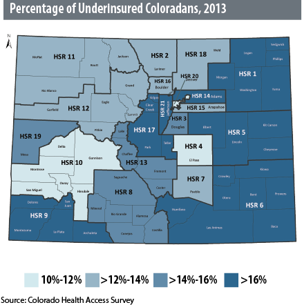 The percentage of underinsured Coloradans has held fairly steady from 2009 to 2013, but some regions have a greater portion of their population underinsured than others. In 2013, the mountain counties of Health Statistics Region 10 had the lowest prevalence of underinsurance, 10.7 percent. The northeast corner of Colorado had the highest percentage of underinsured residents, 22.7 percent.
