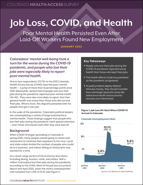 Many people who lost their jobs because of COVID were already at higher risk of poor health because they had lower incomes or faced systemic discrimination and other factors. The Colorado Health Access Survey itself cannot prove that COVID-related job loss caused health declines. However, other research has shown a clear causal connection between job loss and declining mental and physical health.