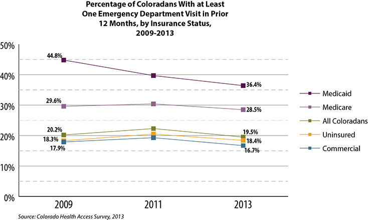 Coloradans covered by Medicaid are more likely to go to the emergency department (ED) than those with other types of insurance, though the rate for Medicaid enrollees has declined in recent years.